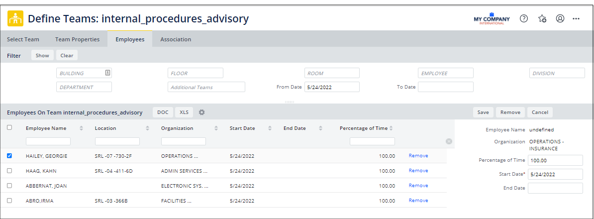 - The system moves the employee to the Employees On Team pane. The employee's Start Date and End Date match the values that you specified in the From Date and To Date fields of the filter.