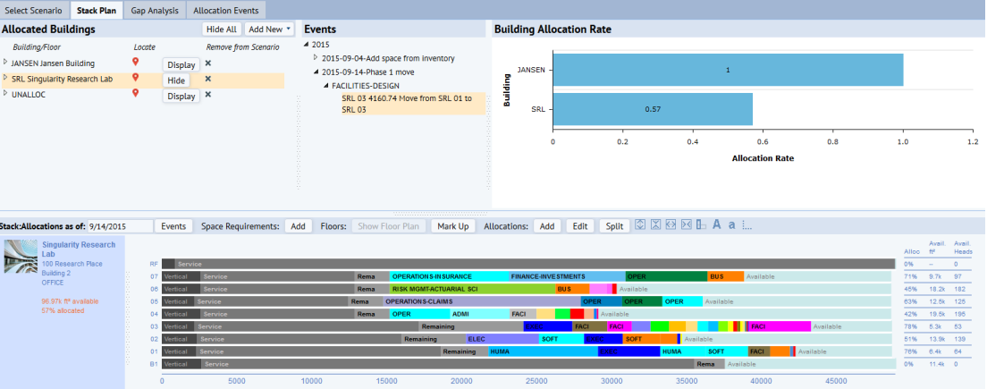 Since the work will be done by October 23, you can model that these offices will be occupied on October 26, Drag and drop the BUSINESS ADMIN-FINANCE department from JANSEN onto SRL-02 and give this event a date of 2015-10-26, as shown in the below image. The stack plan shows that the move of this department from JANSEN to SRL will take place after the renovations are complete. This completes Phase 1 of the scenario.