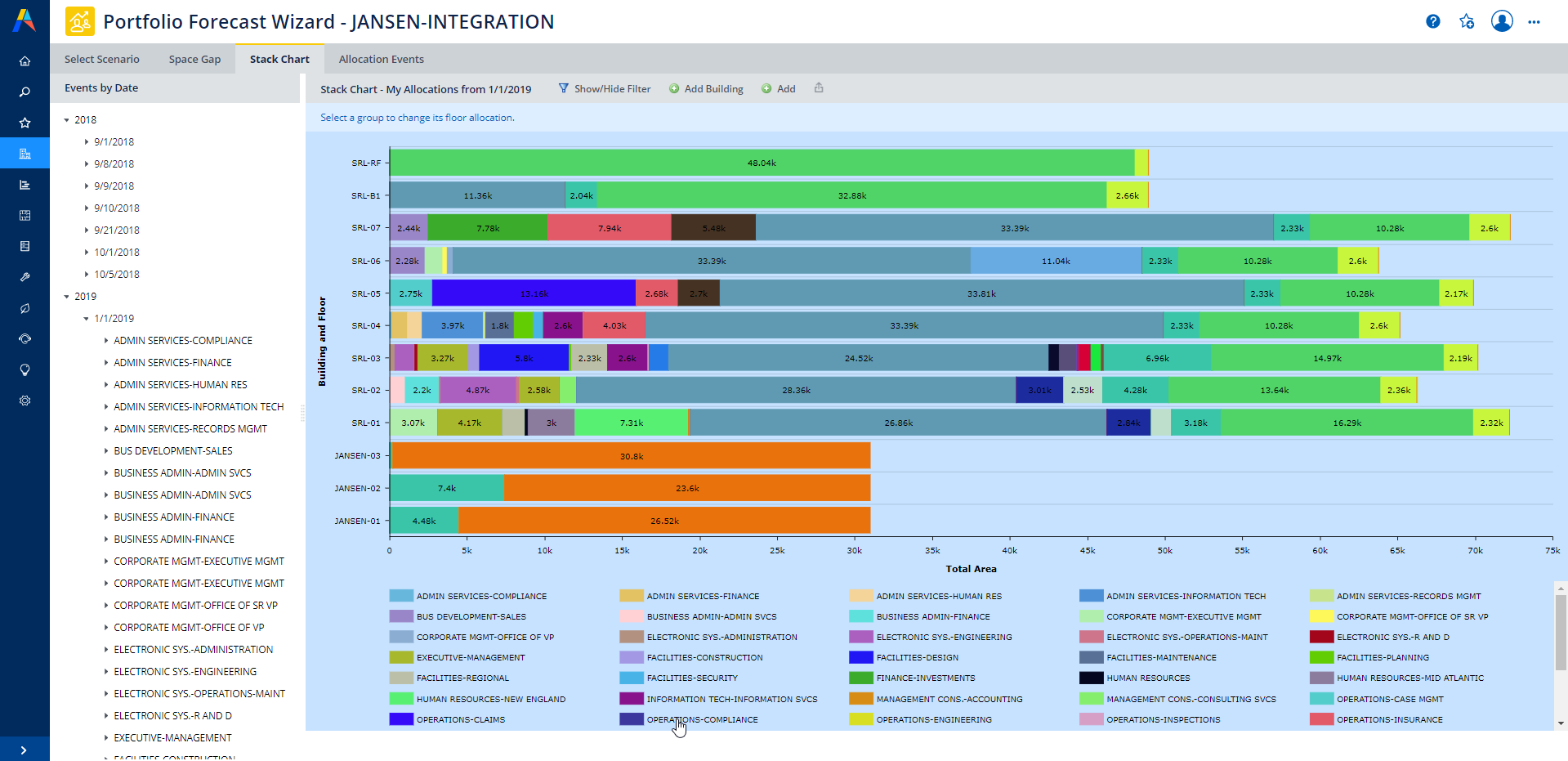 You can use the Forecasting application's Portfolio Forecast Wizard to quickly plan and allocate space over a time period. The application enables you to easily build a forecasting model by allocating floor area to organizational groups. You can manually add estimated areas for these groups, or you can have the system use areas derived from CAD drawings if available.