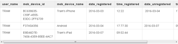 The afm_mob_dev_reg_log table stores a log of the registrations. Below, you can see that user Tram has three devices, but only the iPad is currently registered. On 02-04-2016, Tram unregistered the iPhone and registered the Android. Similarly, on 03-07-2016, he unregistered the Android and registered the iPad.