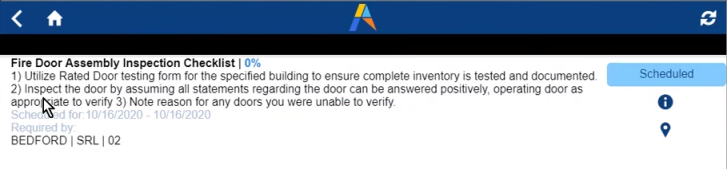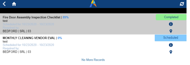 The above screen indicates the checklist status: Scheduled, Missed (Date Scheduled Start has passed), Overdue (Date Scheduled End has passed), In Progress (the checklist has been partially completed), or Completed.