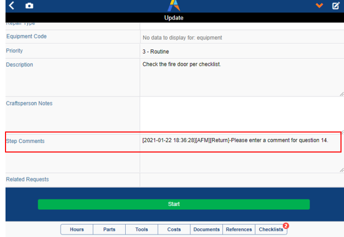 The craftsperson reviews the work request's Step Comments to understand what they must do to correct the situation. This field holds the comment that the supervisor entered when rejecting the checklist. (Scroll to the bottom of the work request to see the Step Comments field.)