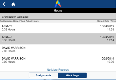 Examine the work logs of all craftspersons assigned to the job (Work Logs tab, accessed from the Hours tab) Examine the hours you are assigned to this job (Assignments tab, accessed from the Hours tab). This is handy for a craftsperson view their scheduled hours so that they can follow the schedule set by their supervisor. |