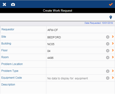 When entering a request, you must specify a location: minimally, you must specify either a site, building, or equipment item. For work outside the building (such as on the grounds or in the parking lot), enter a Site Code and use the Description field to describe the exact location on site. Optionally, you can complete the floor and room. The exact fields that you must complete is determined by how your site sets the The MandatoryLocationFieldsOnReportProblem application parameter.