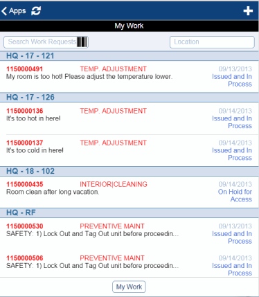 From the My Work list, craftspersons access a list of the jobs assigned to them. They can tap any job and review the description of the problem, priority, location, and other details. If they are not sure the location of the room, they can look it up on the floor plan using the Locate button (the button shaped like an explanation point in the top left of the screen). They can then proceed to the site and get started with the assigned jobs.