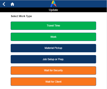 On the Work List and the Update screens, the app adjusts the buttons as necessary to accommodate the currently-selected button. For example, if the craftsperson chooses "Travel Time" to measure the amount of time devoted to travel, the button on the Work List and Update screens reads "Arrived/Paused" so that the craftsperson can log the time that they arrive. Or, if they choose Work on the above screen, the button on the Work List and Update screen changes to Stop so that they can log when they finish the work.