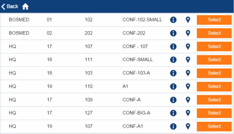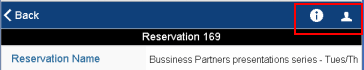 After a reservation confirmed, the requestor can use the "i" button to access information about the reserved room, including an image of the room (if available) so that they can get a sense of the room's layout. The Room Information form also displays the phone number of the reserved room so that the user can call the room directly from the mobile app.