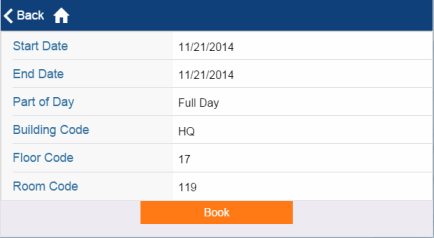 Staff members often need to reserve rooms for meetings, training sessions, or company events. With the Workplace Services Portal mobile app, they can reserve rooms directly from their smart phone and have the Web Central Reservations application or SaaS module manage the reservation. From their smart phone, users choose the Request a Room Reservation task and enter their desired criteria for the room, such as the location, capacity, availability of resources such video equipment, and so on. They then choose the desired room from a list of available rooms.