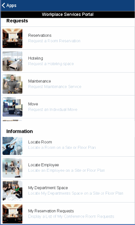 Note: Many of the app's tasks access floor plan drawings so that the mobile user can see the location of the rooms they are requesting or see the location of an employee or department. If accessing the floor plan drawing is a priority for you site, it is recommended that mobile users run the Workplace Services Portal app on a tablet rather than a smart phone. Floor plan drawings occupy significant screen space and may be difficult to view on smart phones.