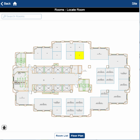 Knowing where a room is located on the floor can save the employee from wandering the halls looking for the desired room. For example, employees may need to attend a meeting in another building and not know its layout; or a building guest, such as a contractor, may need to know the location of the room where they'll be working. Using the Locate a Room task, users simply enter the room number and the system highlights the room on the floor plan drawing. Clicking the Room List button gives them details on the actual rooms.