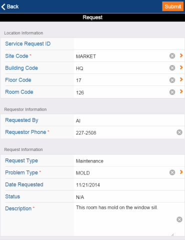 General staff will complete a form similar to the above form for requesting maintenance, except that they will not enter a problem type. When staff sync their device, the request is uploaded to the Archibus server where Web Central's Service Desk application will route the request for approval, estimation, or execution, depending on the rules governing the details of the request.