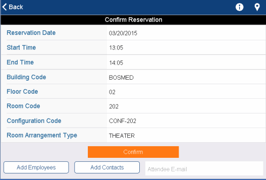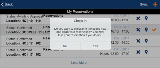 When the requestor occupies the room on the day of the reservation, they can tap the orange check mark on the My Reservations screen to inform the system that they are indeed using the room that they reserved. Once they tap the button, it turns green to remind the requestor that they already took the required action. The user must verify the reservation during the meeting or within 30 minutes of its start or finish time, and the app displays this button only during this time frame.
