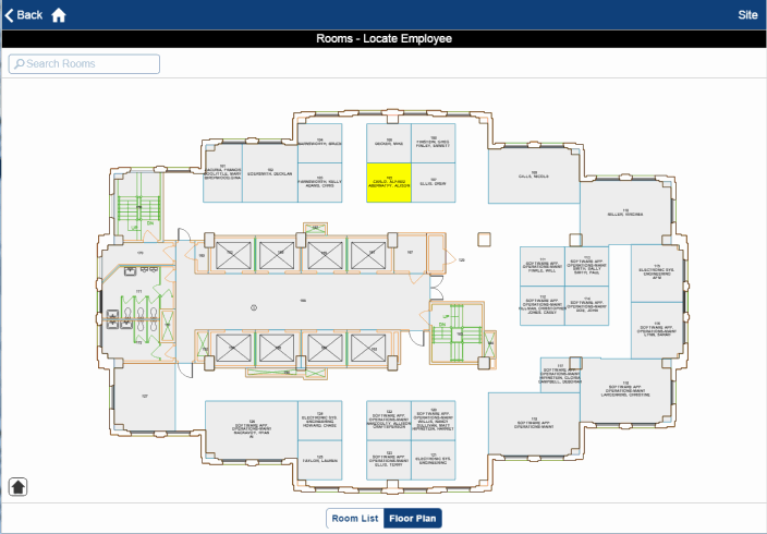 If general staff can easily find the co-workers' offices on a floor plan, they are more like to stop by their offices to discuss issues. The Workplace Services Portal mobile app promotes face-to-face communication among staff because employees can use the Locate Employee task to easily find the offices of their co-workers.