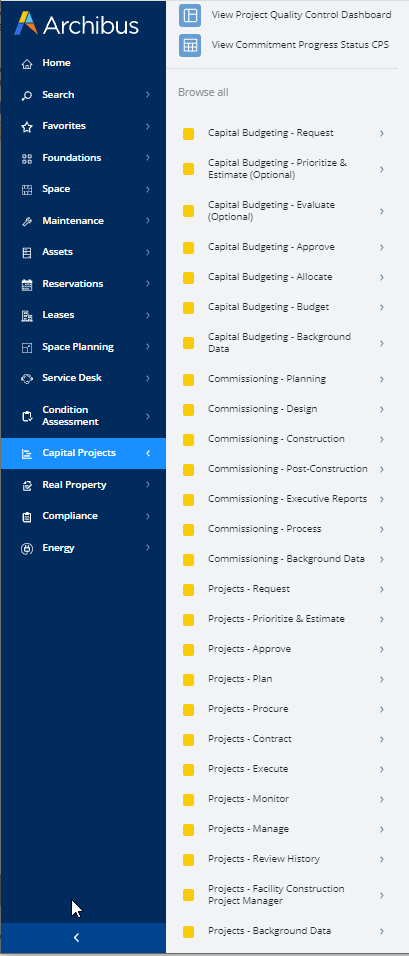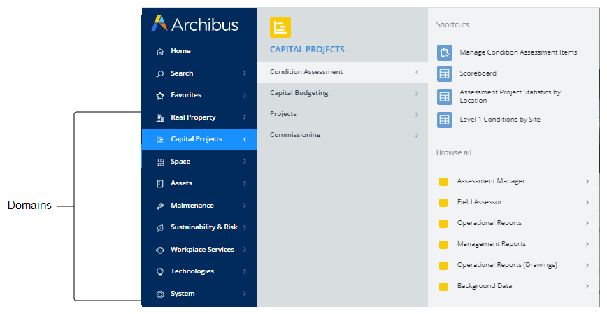 In the Archibus SaaS offering, all modules are presented at the Navigator's application level; the domain level is not used. In some cases, many of the applications of a non-SaaS domain are presented as one entry at the application level of the SaaS Navigator. This is the case for Capital Projects. In the non-SaaS Navigator Capital Projects is a domain with four applications; in the SaaS Navigator, Capital Projects is at the application level and covers three of the four non-SaaS Capital Project applications (Capital Budgeting, Commissioning, and Projects); the fourth application, Condition Assessment, is its own entry at the application level.