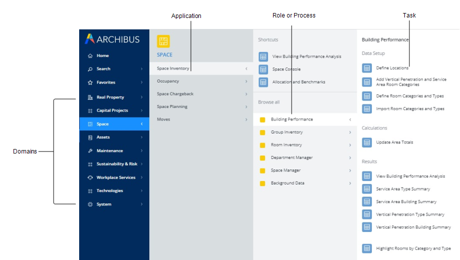 As shown below, a Non-SaaS user might start with a general facility area (the Space domain), a goal within this area (Space Inventory application), choose their role within the application (Space Manager), and then choose from a list of tasks for this role. Instead of a role, you sometimes choose a process, such as Building Performance or Background Data.