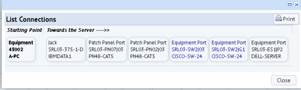 The system traces assets from the selected asset toward the client or server. When the trace function encounters equipment that is multiplexing, the system calls trace called again and looks for all connections on that equipment item's ports. In the above example, the Trace function traced to port 03 on switch (SRL03-SW2). Because SRL03-SW2 is multiplexing, the system called the trace function again from SRL03-SW2 so that it could trace from port G1 to the files server.