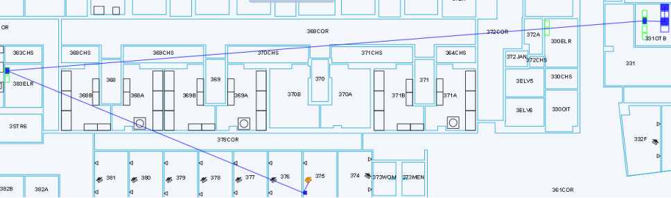 You can see connections with multiplexing equipment in the sample HQ project. The equipment in room 375 connects to a jack in this room, which connects to patch panel in room 283ELR, which connects to the patch panel in room 301OTB, which connects to port 3 on the switch in room 331OTB. Port G1 of the switch connects to port 2 on the file server (SRL03-ES1)