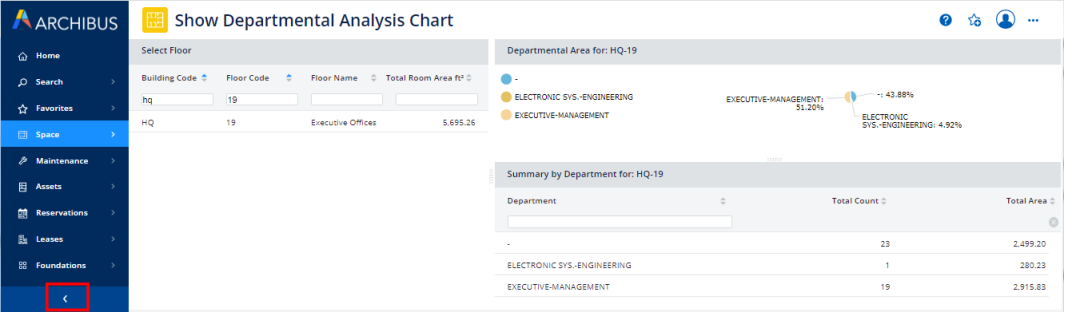 Once you select a task, the Navigator loads the view, collapses the drawers, but retains the side-bar navigation panel. For example, in the below image the user moved through the Navigator to select the Space / Space Manager / Show Departmental Analysis Chart task.