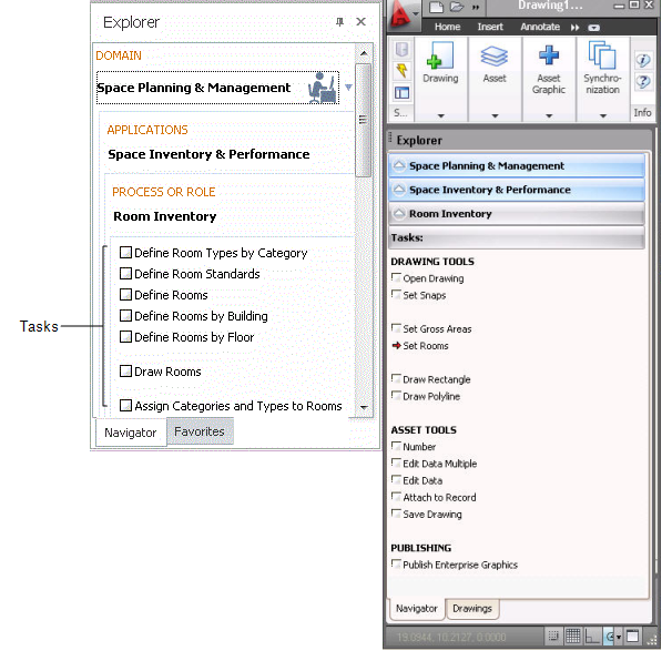 In the Navigator in CAD, note that tasks do not load views; instead, the Navigator presents as tasks the asset commands and CAD commands that you will find convenient for working with asset symbols in CAD plans. For example, the Navigator for the Room Inventory process lists commands for working with polylines and converting them to asset symbols.