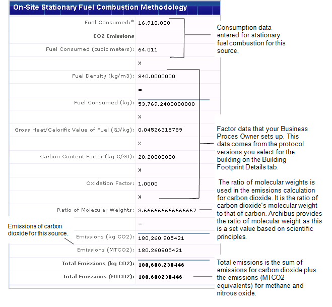 The following image shows the half of the Methodology form that provides the calculations and factor data for carbon dioxide emissions for stationary combustion:
