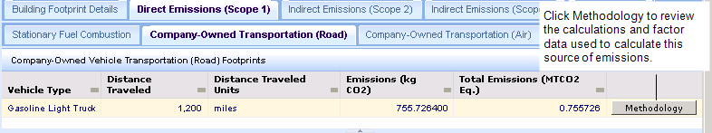 Once the application calculates emissions, you can click the Methodology button in any data row in the Footprints panel for a source of emissions to review the calculations and factor data used.