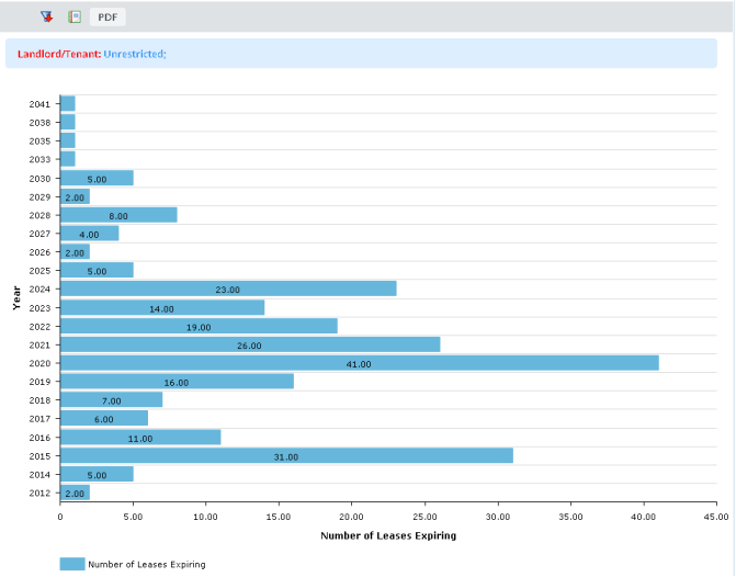 Use the Archibus SaaS / Leases / Lease Reports / Expirations task to graphically see your lease expirations in a bar graph. You can export the data to a report or PDF using the icons at the top of the chart.