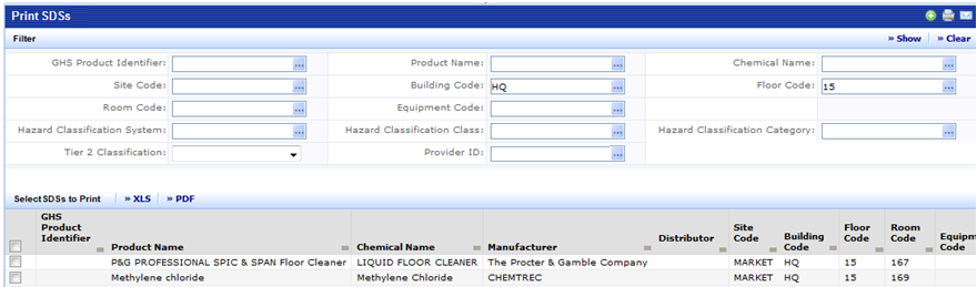 2. The system presents a filter console so that you can enter search criteria for a set of SDSs. For example, you many want to search for all the SDSs associated with a particular room, so that you can print out all the SDSs for this room and set up a binder of hard-copy SDSs for products associated with this room. Enter the search criteria and click "Show." The system displays the results in the lower pane.
