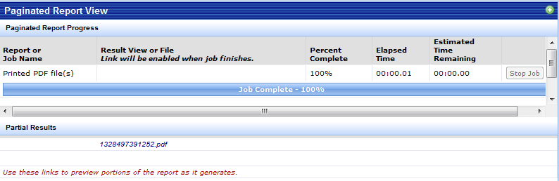 If the print job will take a long time, you can check on the status of the printing in the My Jobs tab. Once the application finishes the print job, click the link on the screen to open the PDF file and send it to the printer of your choosing. For example, the below image shows the link to the PDF resulting after selecting the Print Selected SDS button.