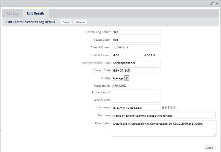 Communication logs document written correspondence and verbal communication concerning your leases. Use them to enter notes about conversations, phone calls, e-mail, and so forth. For written correspondence, you can create a communication log summarizing a letter or fax, scan the document, and store it in the Document field for the log.