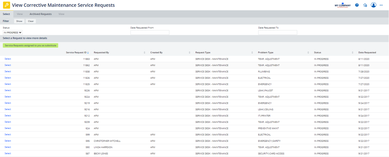 Use the Maintenance / Corrective Maintenance / Client / View Maintenance Service Requests task to check work requests that you have reported, as well as view any active or archived corrective maintenance request. You can use the filter to enter search parameters.
