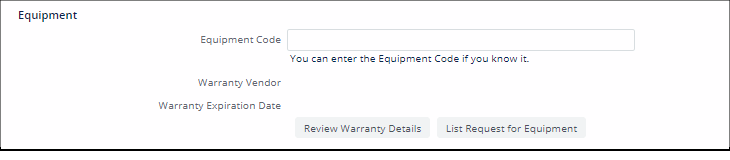 When you enter work requests that involve equipment repair, you can select the equipment from the Equipment section of the Report Problem form. If you have not yet added the equipment, you can add the Equipment Code and Equipment Standard from the form. To add more details, such as warranty information, see step 4.