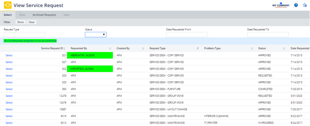On the first tab, Select, the system presents all requests you have requested or entered, or are assigned to you. Select a request and then move to the View page which gives details for the selected request.