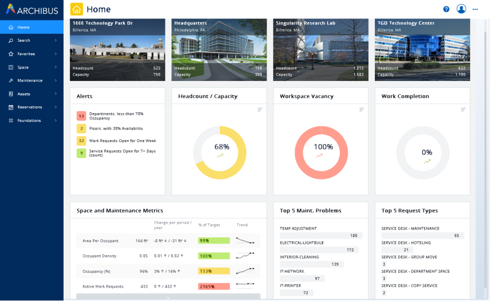 For the various roles and users in an organization, an Archibus administrator can design home pages that offer information focused for this type of user. Home pages list important metrics, statistics, and alerts so that you can quickly determine the state of your issues and critical issues. Home pages display in the workspace area to the right of the sidebar navigation panel.