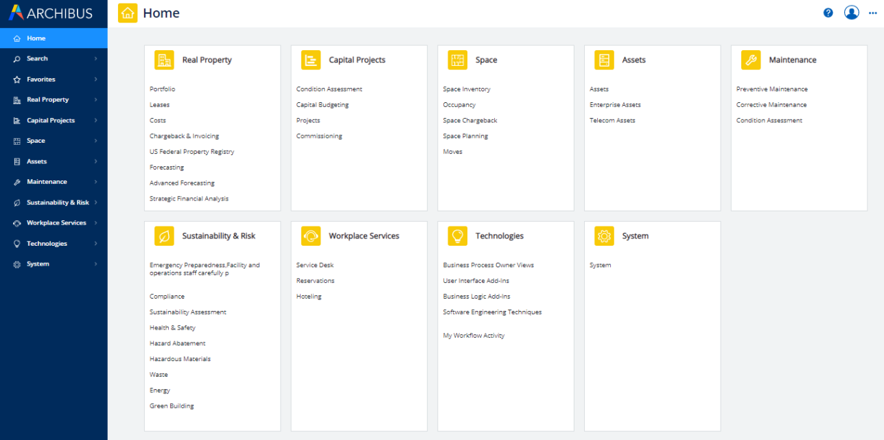 Access the Applications home page from the Home Page menu. The below image shows the Application home page for the non-SaaS offering; Archibus SaaS had a similar home page listing the modules.