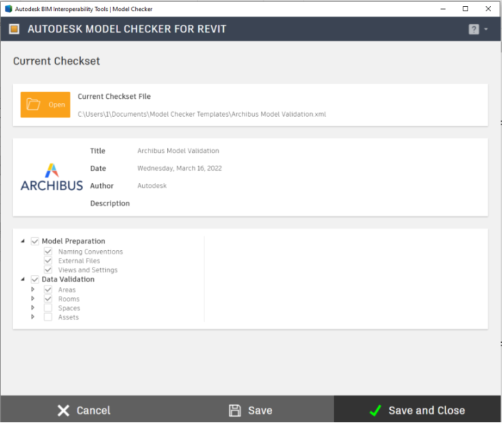 The Archibus Model Checker is built on the Autodesk Model Checker. For information on the Autodesk Model Checker, see this Autodesk video: https://www.youtube.com/watch?v=Mj5JCm8eC5E