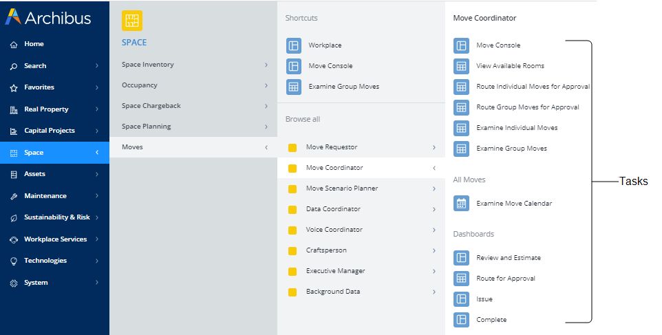 For example, the Move Coordinator role of the Moves application includes tasks for reviewing reports, accessing the Move Console, and estimating, issuing, and routing moves.
