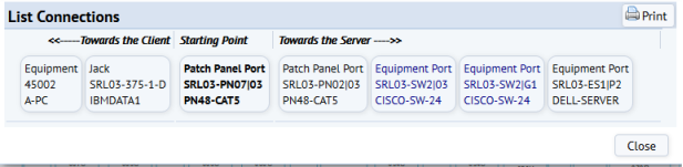 The system traces assets from the selected asset toward the client or server. When the trace function encounters equipment that is multiplexing, the system calls trace called again and looks for all connections on that equipment item's ports. In the above example, the Trace function traced to port 03 on switch (SRL03-SW2). Because SRL03-SW2 is multiplexing, the system called the trace function again from SRL03-SW2 so that it could trace from port G1 to the files server.