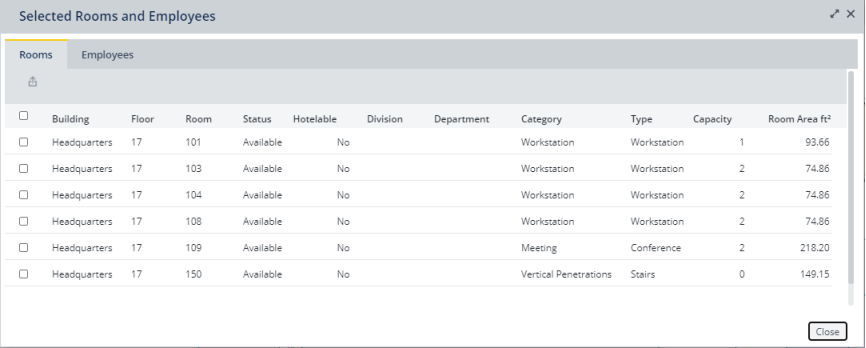 - When you finish reviewing, editing, or exporting your rooms, click the Close button. Archibus returns you to the floor plan and cancels your selection set.