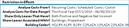 The restriction is printed as a formatted table placed at the top of the reports, as shown below: