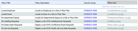 If the task is located under the Information section, such as View My Space Requests, you add or remove WORKSVC-MOB from the Security Group field in the Archibus Mobile Menus table.