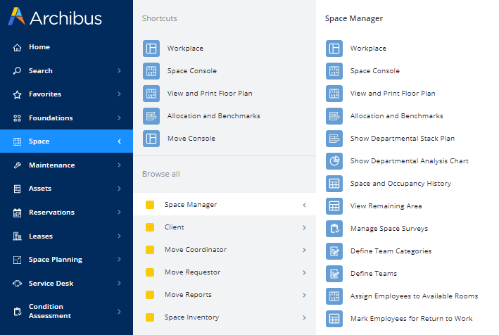 To manage space, you work with the Space Console. If you are upgrading from Archibus Foundations, you have already used the simplified Space Console (ab-sp-console.axvw), which does not include the team space features.