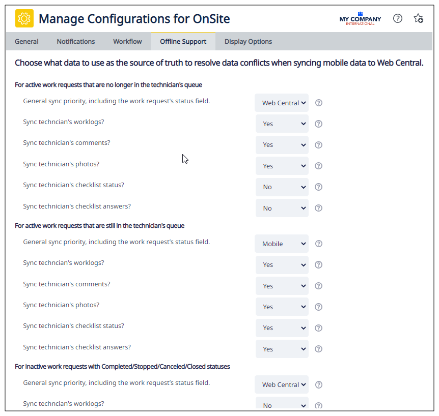 For example, suppose for work requests that are no longer in the technician's queue, you set that the Web Central server data will be the source of truth (mobile data will be discarded). However, you still might want to upload the labor hours because technicians did spend time on the job. Likewise, you may want to save the technician's comments. In this case, you could set General Sync Priority to Web Central and then set Sync Technician's Comment to Yes and Sync Technician's Work Logs to Yes.