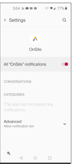 Under Advanced, you can also control whether or not the Notifications bell-shaped icon at the bottom of the OnSite screens displays a dot when there are new notifications.