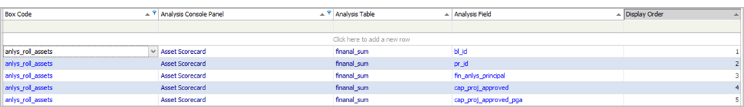 Add-In managers use the Capital and Expense Matrix - Fields (finanal_matrix_flds) table to establish which analyses values are displayed in the Financial Analysis Console's panels when users click on one of the boxes in the (Capital and Expense) Analysis Matrix.