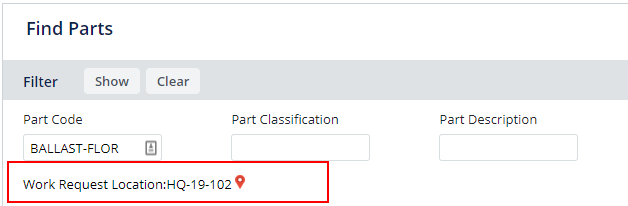 The Part is saved to the Work Request Part Usage (WRPT) table for the desired storage location, and is given a Status of either Reserved or Not in Stock.