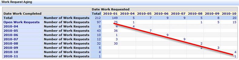 For example, in the below image, you can see that 5 work requests were requested in April 2010. Of these 5 requests, 4 were completed in April, and 1 is still open. Click on the cell for the open item to review this request and determine why it is delayed.