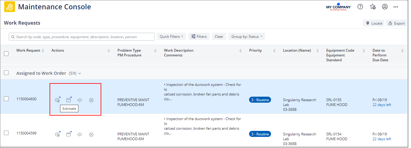 Click an action icon to perform this action on the work request in this row. For example, clicking the Estimate icon presents the Estimate Work Request form.