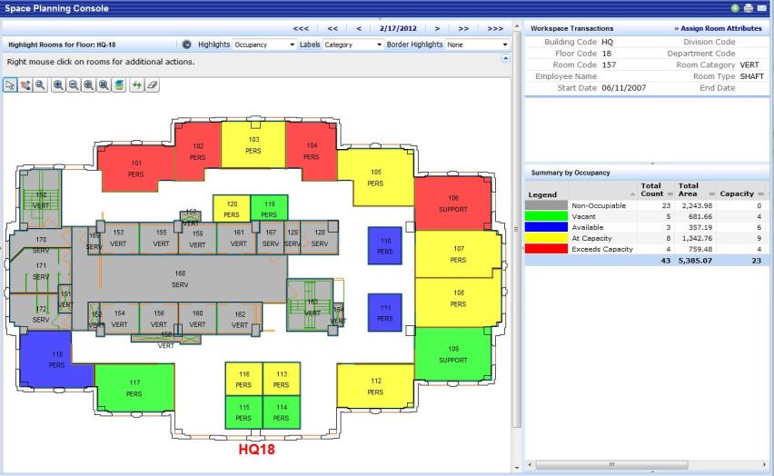 If you are not a space manager, your drawing will indicate only available and vacant rooms for tasks involving assigning employees to rooms. Because you likely do not have a complete picture of space needs and do not manage the space occupancy system, you cannot assign employees to over-capacity and at-capacity rooms.