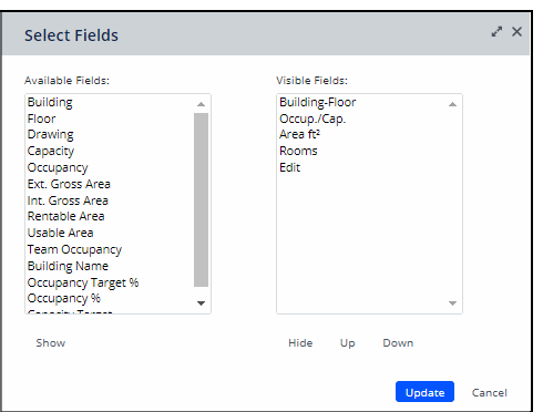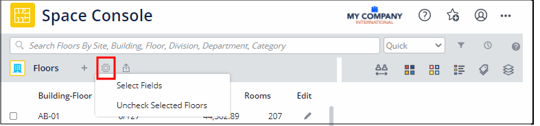 To access the Select Fields form, click the Gear icon and click Select Fields from the fly-out menu. The Gear icon is available on each tab, as well as in the Floors list.