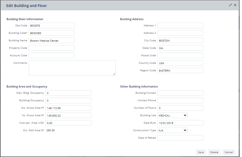 Click the Edit button (pencil icon) for the floor you wish to edit, and the Space Console presents the Edit Building and Floor form. You can review and edit basic information about the floor and building.